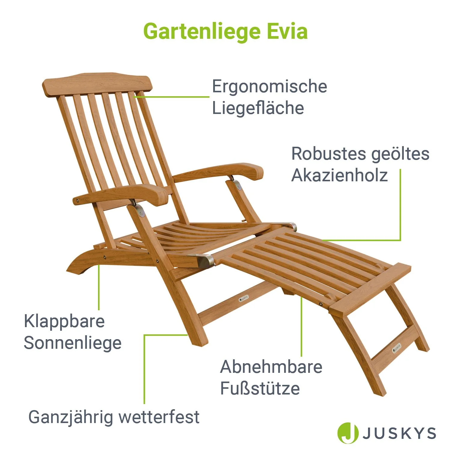 Die Juskys Sonnenliege Evia ist eine wetterfeste und klappbare Gartenliege aus geöltem Akazienholz, ideal für Garten, Balkon und Terrasse. Sie bietet dir eine komfortable Liegefläche und eine vierfach verstellbare Rückenlehne, damit du deine Lieblingsposition einfach findest. Die abnehmbare Fußstütze sorgt für zusätzlichen Komfort. Mit ihrem robusten, aber leichten Design lässt sich die Liege schnell zusammenklappen und überall hin transportieren. Zudem ist das Holz UV-beständig und wasserfest, was Pflegeleichtigkeit und Langlebigkeit garantiert.